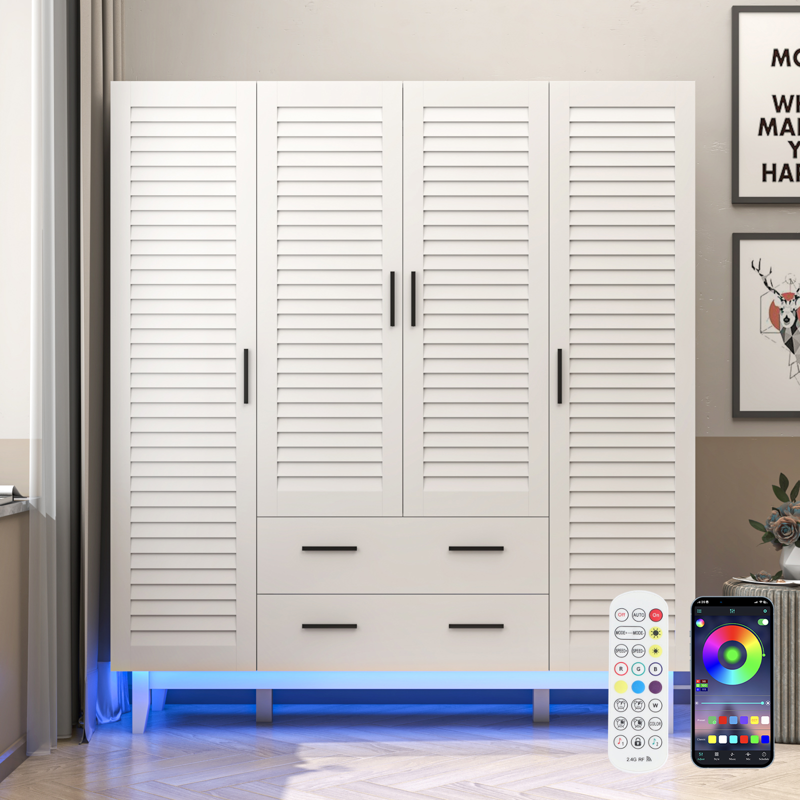 This 4-door wardrobe with shutters has a unique design that is stylish and practical. It is made of high-quality MDF and particle board, which provides excellent durability and stability. The surface is waterproof and scratch-resistant, providing a safe and reliable storage environment for your clothes. The wardrobe has 4 shutter door designs, adding a retro feel that makes the entire wardrobe look more elegant. The metal hanging rod on the door is suitable for hanging long dresses, suits, etc., while the multiple compartments and drawers inside provide flexible storage space. The bottom drawers are designed as 2 drawers, making it easy for you to classify and store items of different sizes to meet your different storage needs. The support feet are made of pine wood and are shaped with a beveled design to increase stability. The skirt is designed with an arched shape to make the entire wardrobe look more beautiful. In addition, this wardrobe is equipped with an RGB LED light strip that can be controlled by a remote control or a mobile phone Bluetooth APP, allowing you to easily find the clothes you need in a dark environment. The black hardware handle design adds a sense of overall grade, making your wardrobe a highlight of your home decoration. This three-door wardrobe with shutters is not only practical but also stylish and retro, making it an ideal choice for your home storage.