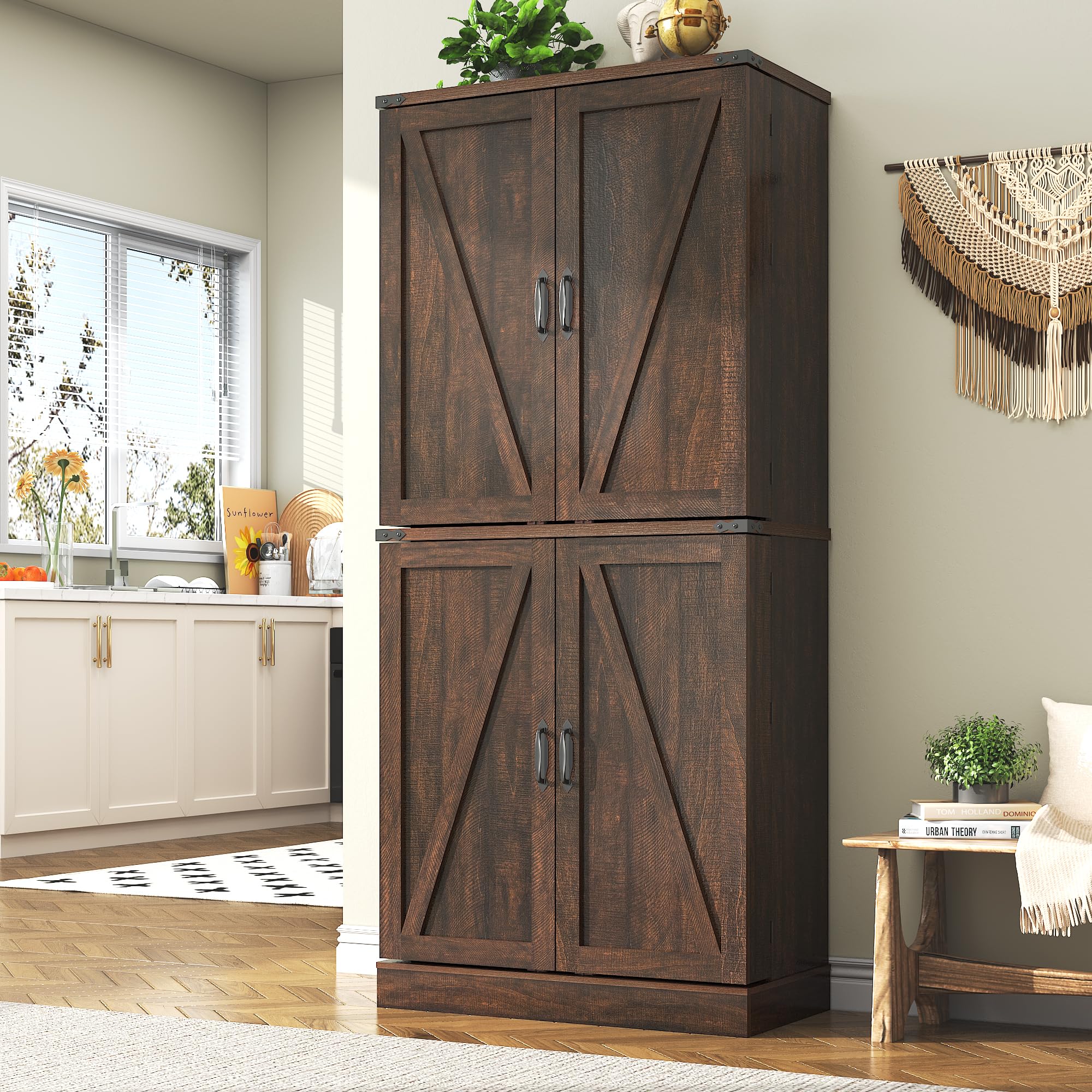 - 1、71" Tall Farmhouse Kitchen Pantry with 12 Side Shelves, 5 Layers Pantry Storage Cabinet w/Load-Bearing Steel Pipe & 4 Barn Doors/Adjustable Shelves for Kitchen, Dining Room, Living Room