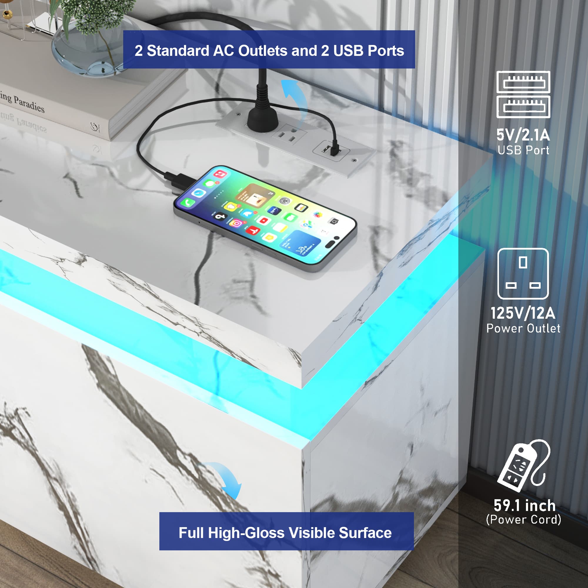 - The large TV stand have built in a power strip, included 3x power outlets and 2x USB charging ports, convenient for us to connect the power cords of TV, video equipment, game console equipment or charge mobile phones nearby to avoid clutter on the desktop.
