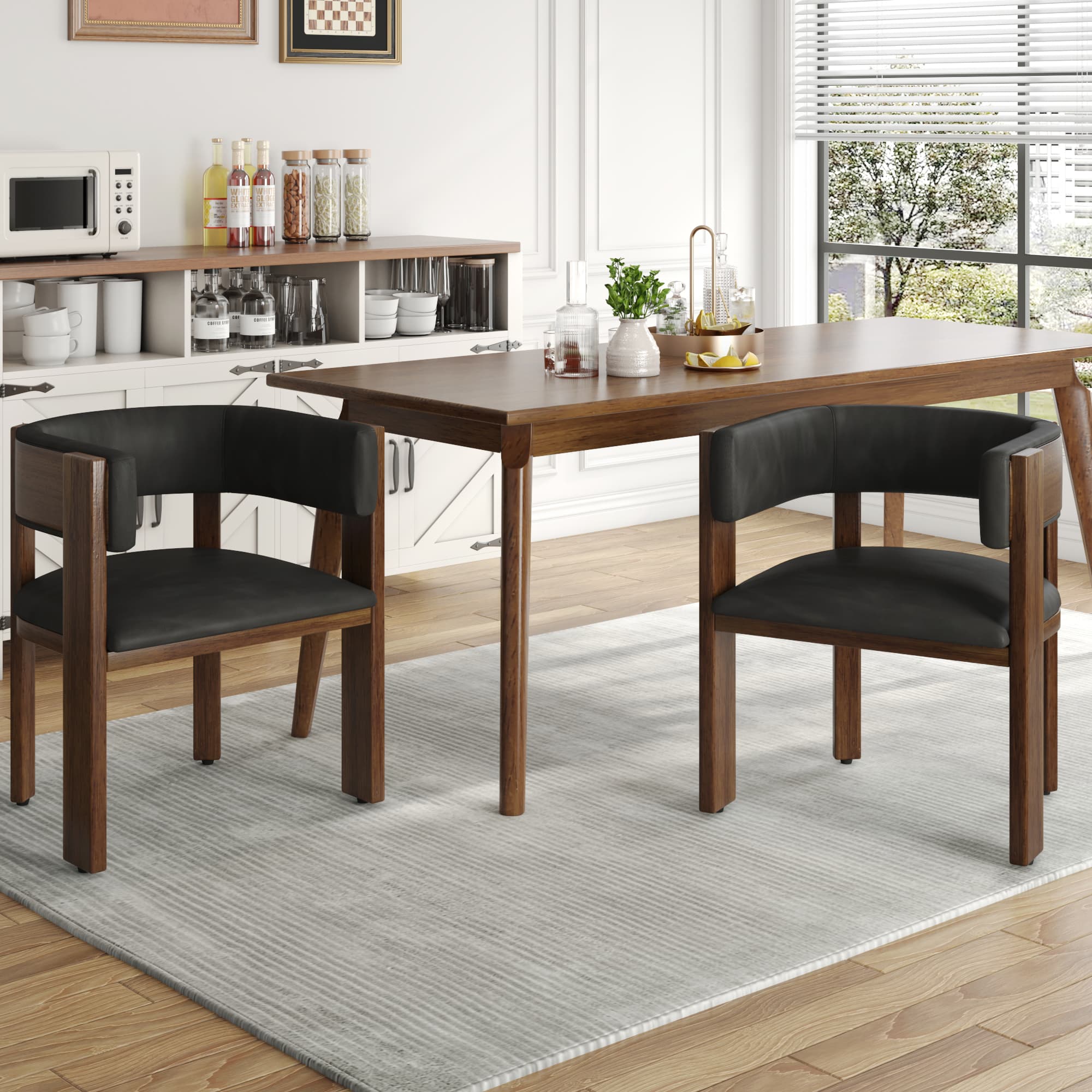 Upholstered Dining Chairs with Arms, Mid Century Modern Faux Leather Barrel Kitchen Chair with Solid Wood Legs