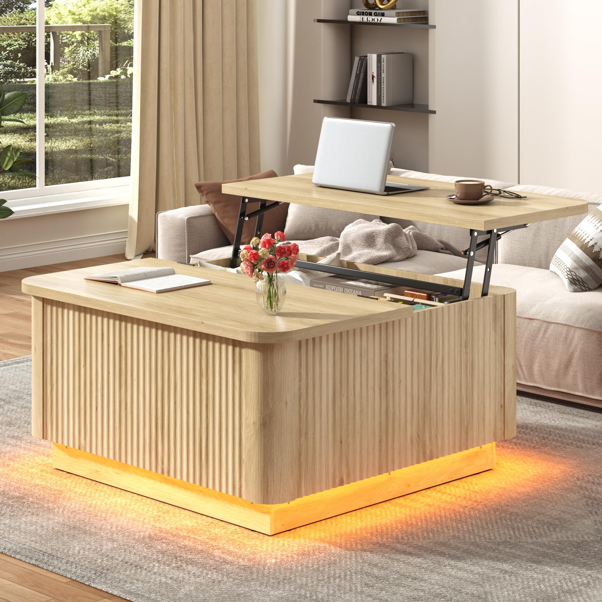 Lift-Top Coffee Table: The modern coffee table's top effortlessly raises to the correct height (up to 6.3 inches). The versatile gas-operated lift provides smooth and safe lifting. The design features a slow-rebound hydraulic support rod that effortlessly raises and lowers the table, allowing you to work, write, or dine comfortably on the sofa.