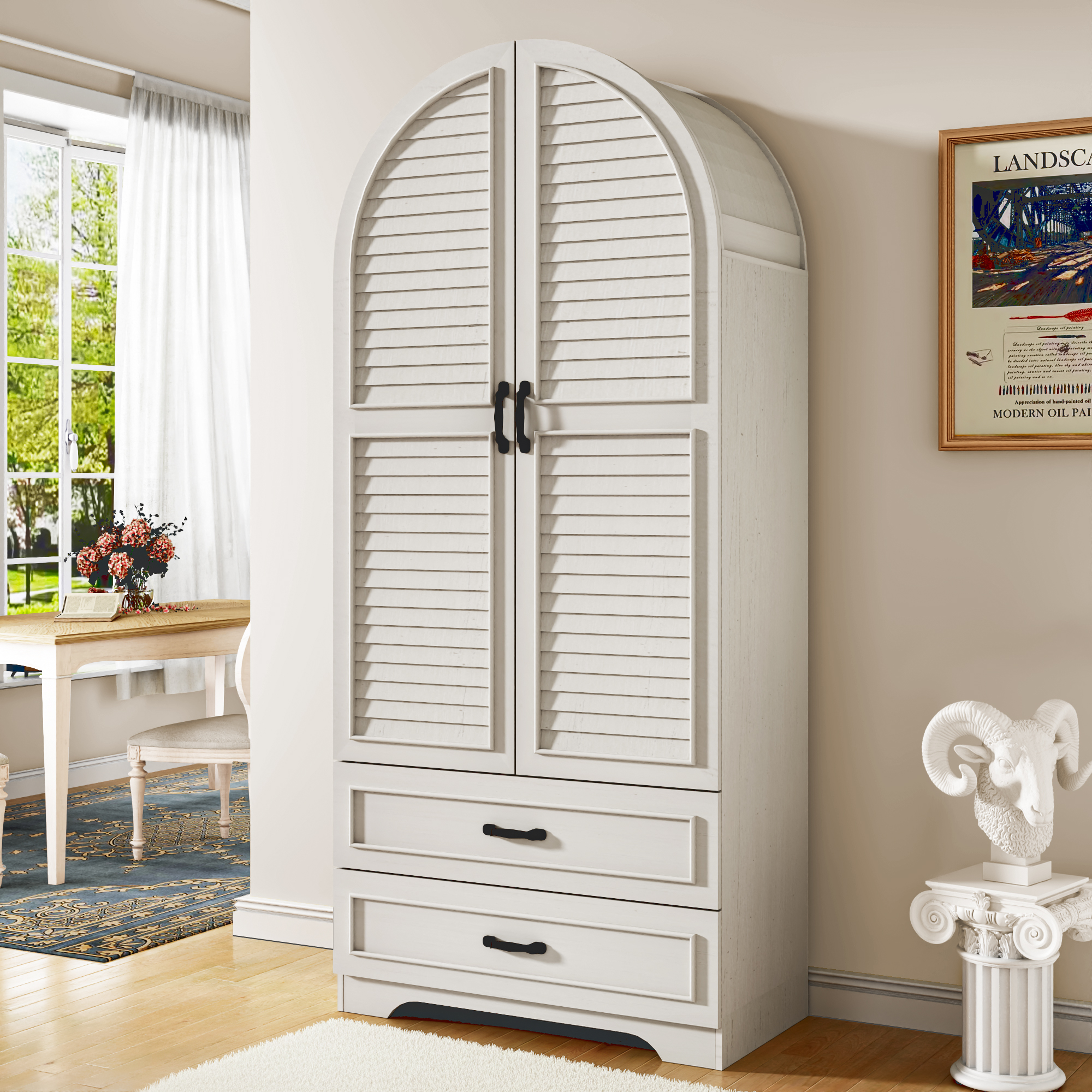 - Farmhouse Pantry with Arched Design: Blotout Kitchen pantry featuring elegant arched top and louvre doors, this cabinets for storage with doors brings authentic farmhouse charm to any space, whether used as a kitchen cabinet pantry or a decorative storage piece.