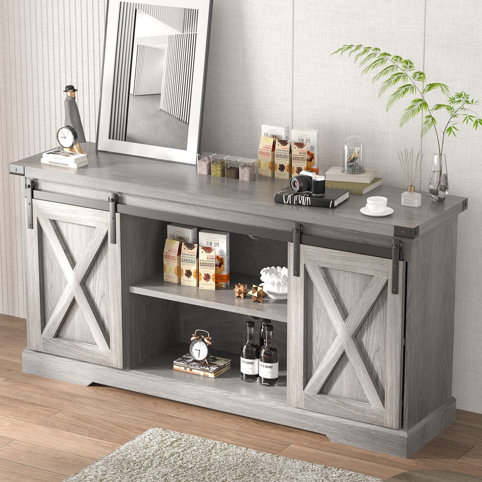 - Mulit-Function Cabinet: You can also place the storage cabinet as a enterway cabinet in a prominent place and display your collection by sliding the barn door. this cabinet can serve as a TV stand entertainment center for up 65" TVs in the living room, or a buffet table in the dining room.