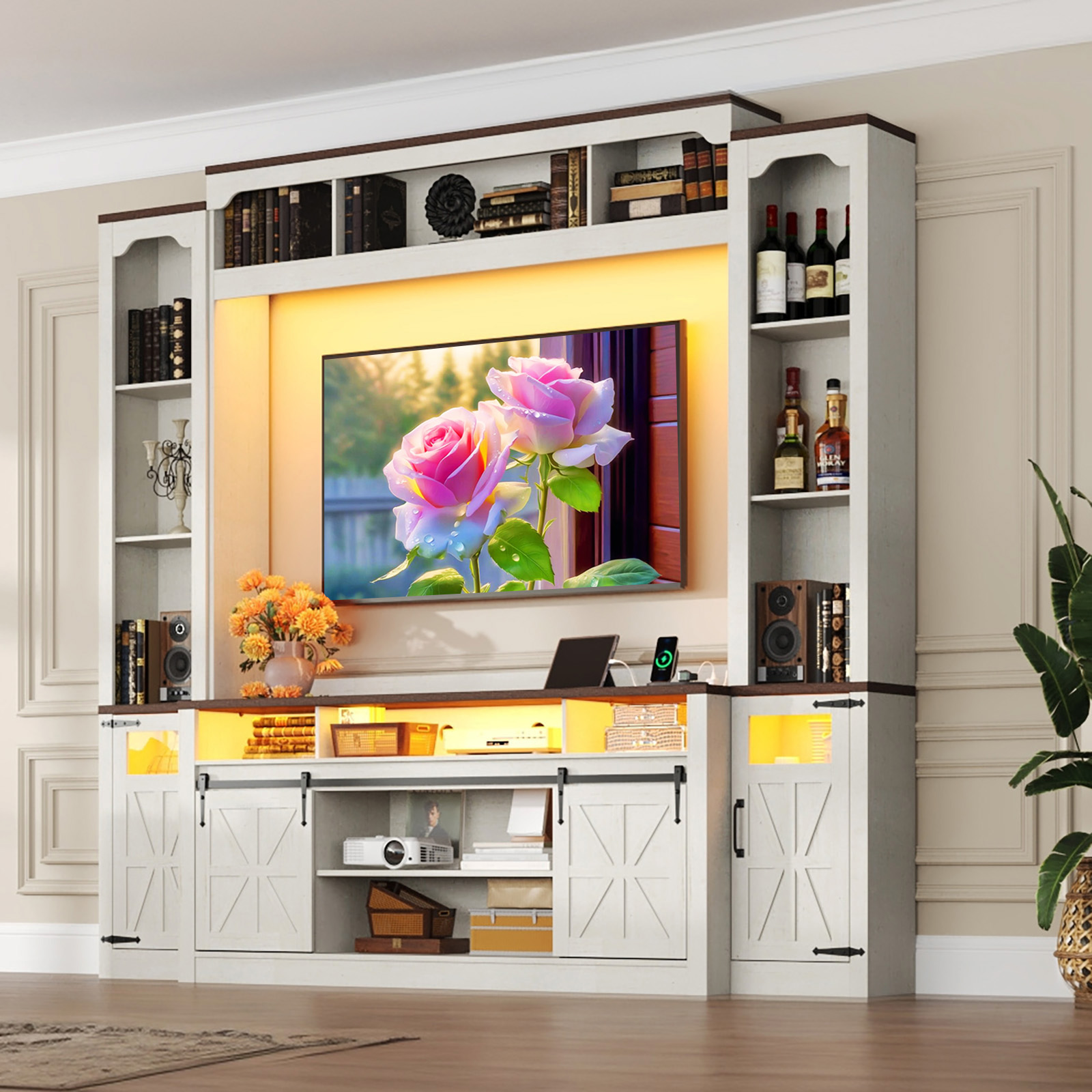Farmhouse Wall Unit TV Stand with Storage for TVs up to 75", Large Entertainment Center with Bookshelves, LED Light & Power Outlet for Living Room
