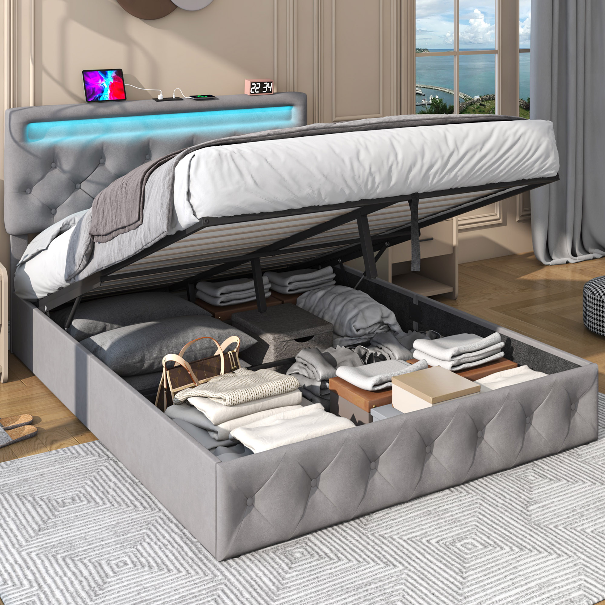 Selected grey/baige flannel covered, 2.5cm thick headboard sponge, matched with 20 color LED Light and charging station, and the large under bed storage, makes Blotout lift up bed frame is a mulit-funcitonal multifunctional combination bed frame, is designed for you who want to enhance the bedroom quality. First, this lifting up bed frame provides ample space to store extra bedding, clothing, shoes, and other items, especially helpful for smaller bedrooms or apartments where storage space is limited.