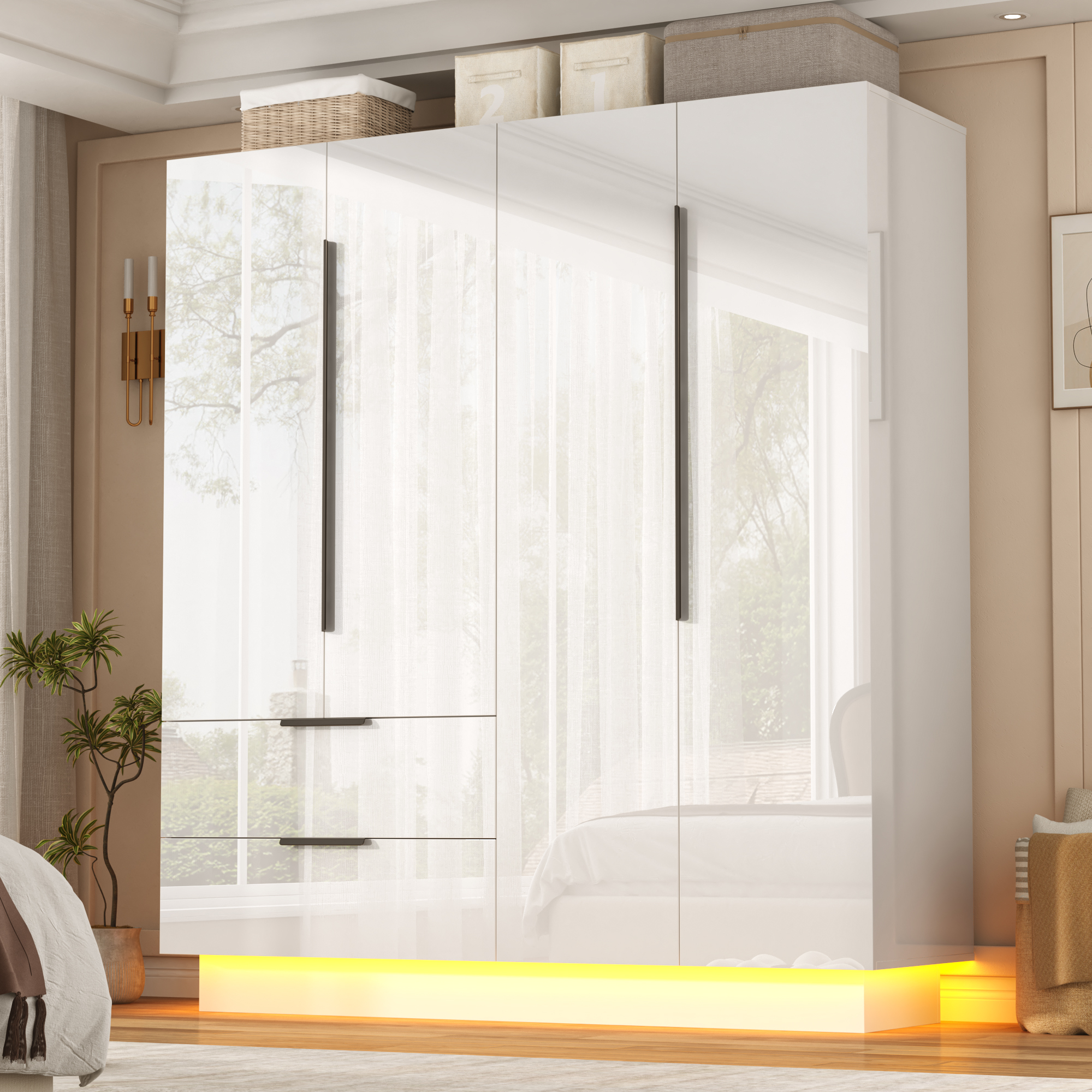 - 4 Door High Gloss Armoire Wardrobe: Premium scratch-resistant high-gloss finish delivers a luxurious reflective look, with a LED floating base design to instantly elevate modern bedroom decor.