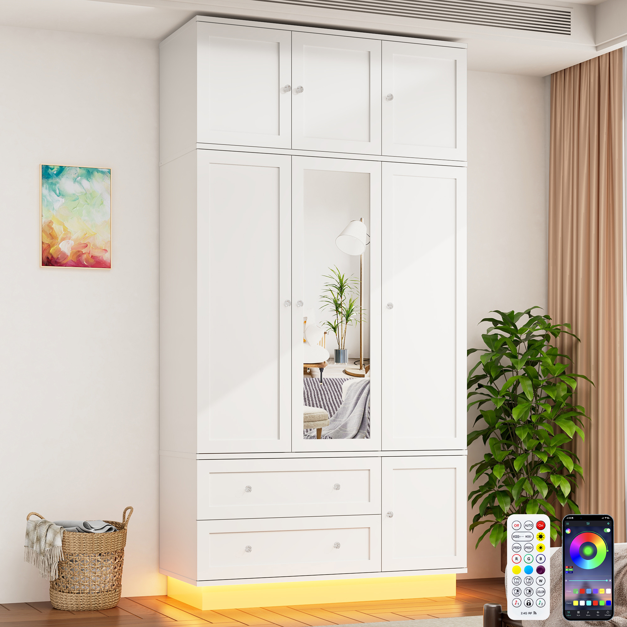 - 3. LED Wardrobe Armoire with Floating Light: The clean white finish and minimalist style complement any bedroom decor. Enjoy two-way control for your LED strip lights—use the convenient remote controller or the dedicated smartphone app to switch between 25 dynamic modes, sync with music, or set a timer. The compact footprint (47.3" W) fits perfectly in small spaces while offering grand storage capacity.
