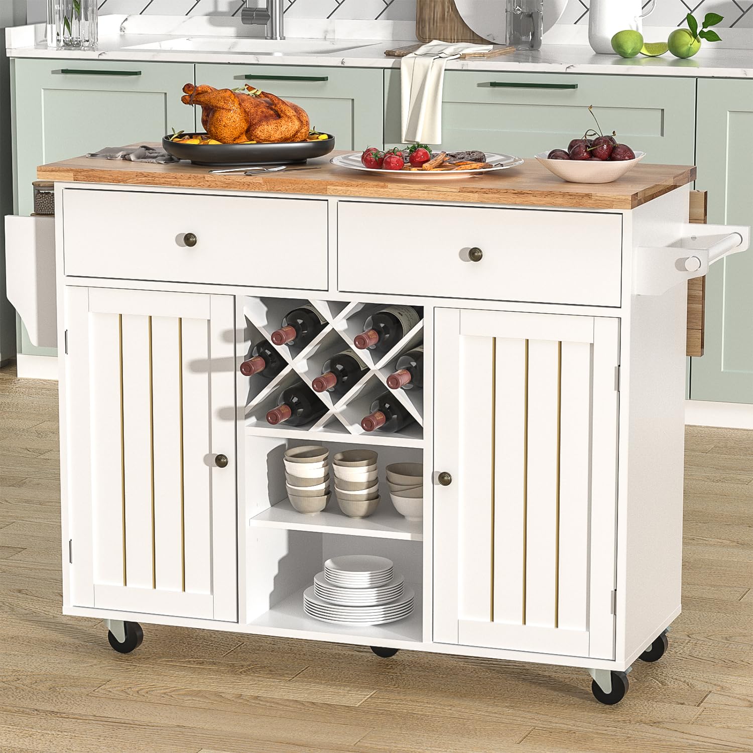- Kitchen Island with Large storage: Practical kitchen island with drop leaf provide more storage space for your small kitchen. Blotout kitchen storage island featured with 2 concealed cabinets with adjustable shelves , 2 open storage shelves, 2 storage drawers, 1 spice rack, 1 towel bar and some hooks, provide you with large storage space for your vegetables, fruits, drinks, and other kitchen necessities. Especially a wood removable wine rack for 6 bottles in the middle, make the kitchen cart be a beautiful bar cabinet.